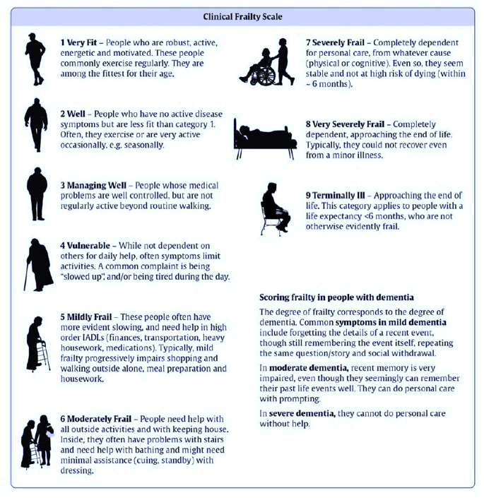 Clinical frailty refers to a medical condition characterised by decreased physiological reserve and increased vulnerability to stressors, resulting from cumulative declines across multiple organ systems. Frail individuals are at higher risk of adverse health outcomes, including falls, fracture, disability, hospitalisation and mortality. The Rockwood Clinical Frailty Scale (shown above) is a tool used in clinics to assesses frailty on a scale from 1 (very fit) to 9 (terminally ill) and is one of the most validated frailty scales. Identifying and managing frailty is important for optimising health outcomes and quality of life.